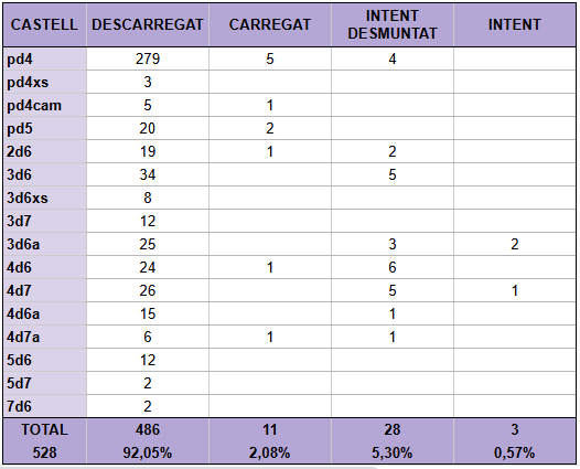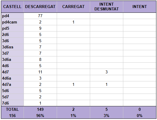 A continuació us detallem la totalitat de castells realizats per la colla (actualitzat per any) a nivell global, anual i detallat per actuació: